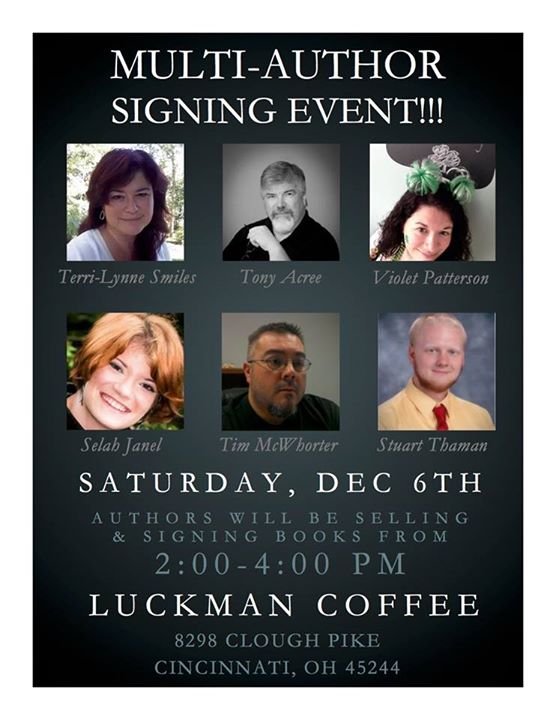 Yep, I’ll be out and about with the rest of the crazies! If you’re in the Cincinnati area, be sure to come around to the Luckman Coffee on Clough Pike and check out our books – after all, the holidays are around the corner! Barring that, I’m sure we’ll be getting up to hijinks an interesting conversations – writers and coffee, after all…it’s almost a given. Anyway, this event is on Saturday, Dec 6 from 2-4 pm. Check us out and come have some fun!