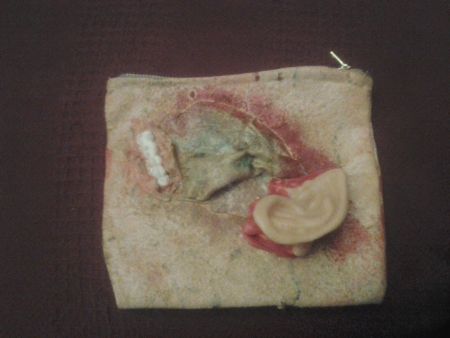The basic purse can be canvas (I’ve used white denim, too) in a white or light color. I flat line it with the lining, sw up the sides, pop the zipper in. Outside is mask latex dabbed and layered onto the fabric after having been colored with paint. Veins and other detailing are put on later – I’ve even done little bristle hairs in some cases, though it depends on how gross you wanna get. It is a bit of a trick to get the consistency of things right, and when you’re gluing things on you always have to think about what looks good and isn’t just something plunked onto a bag.. Teeth were cast by me, though I want to play with that in the future, coloring-wise. Ear is from a dollar store that sells that sort of thing by the bag at Halloween. All in all, a snappy little statement piece for the horror lover in your life, or for those times you really want to get conversation going at the grocery store.
